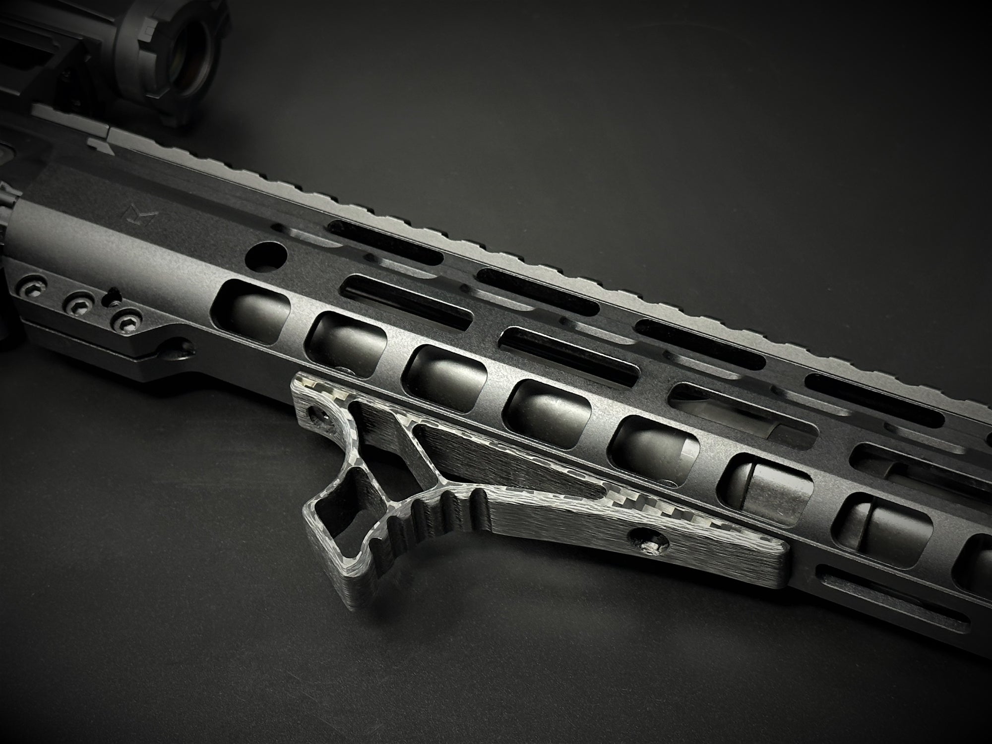 Machined from solid carbon fiber plate with integrated M-LOK lugs for a secure, low-profile fit. Designed to improve grip consistency without unnecessary bulk.